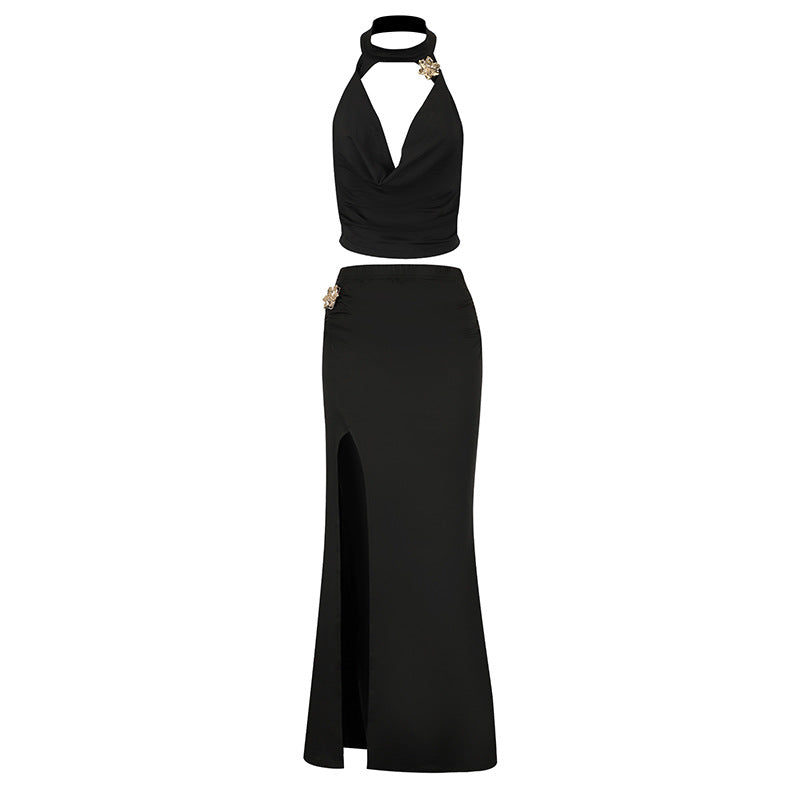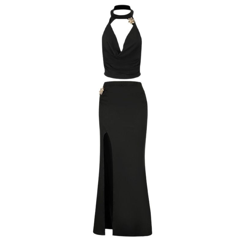 Backless Swing Collar Neckline Waist-Cinching Top with Skirt set