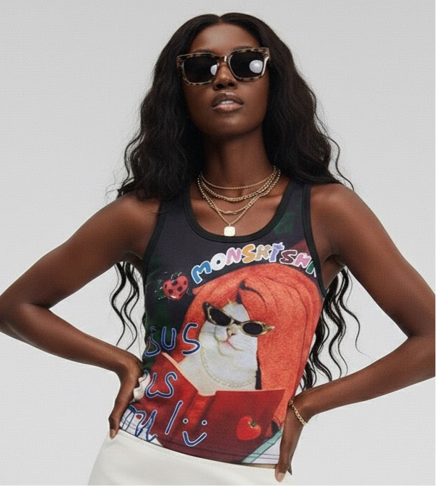 Cartoon Cat Print Tank Top Women Summer Slim Fit Versatile BF Style Undershirt Sleeveless Outerwear