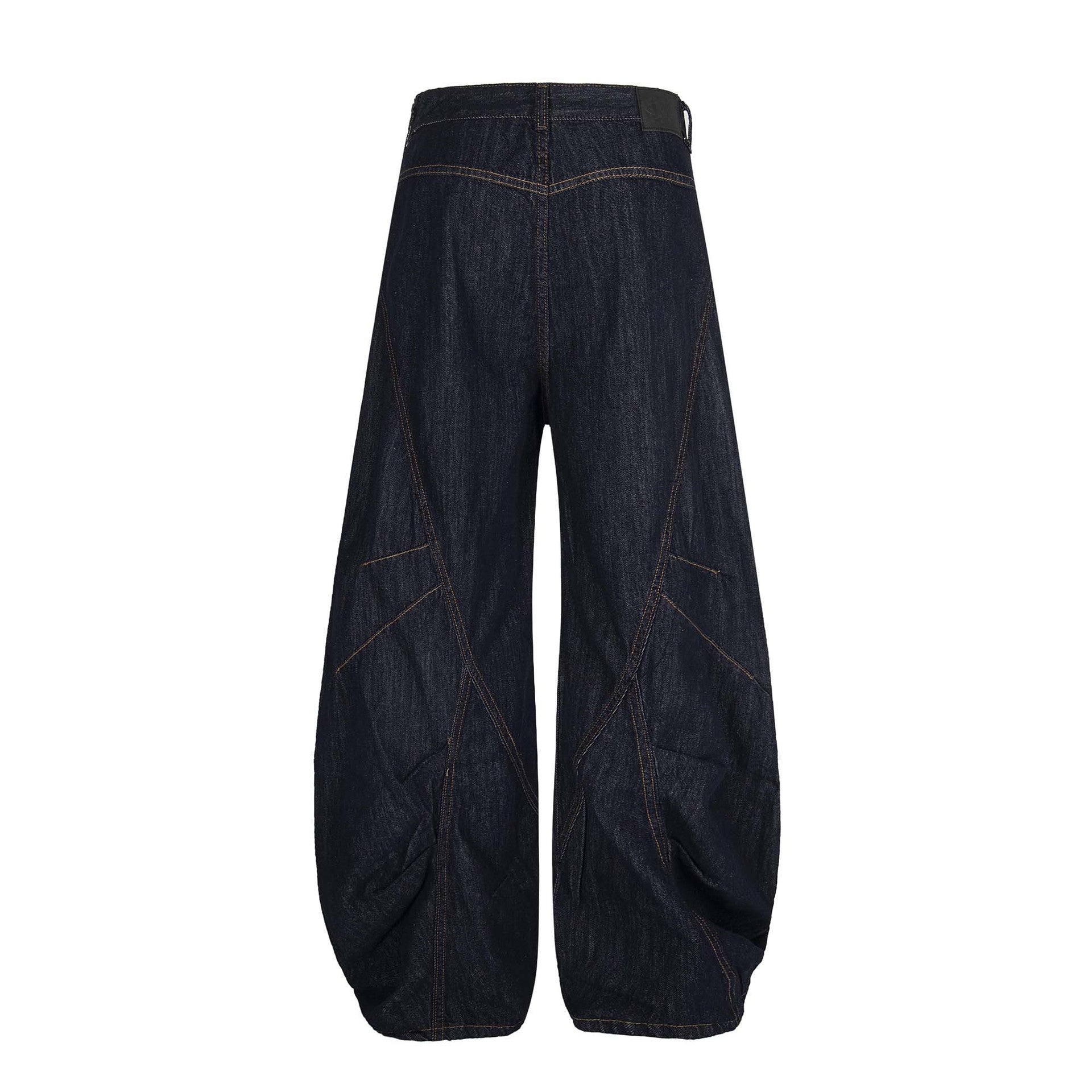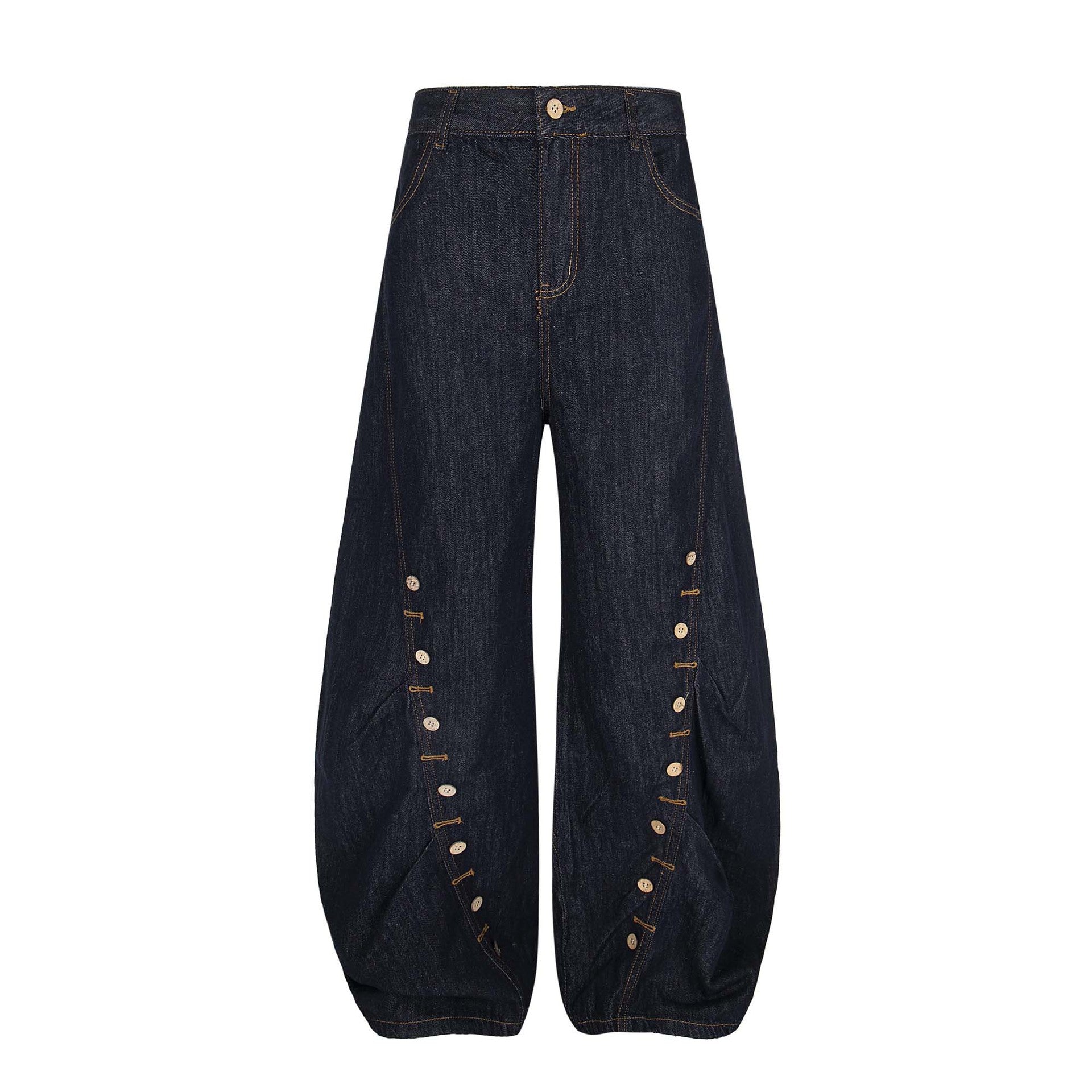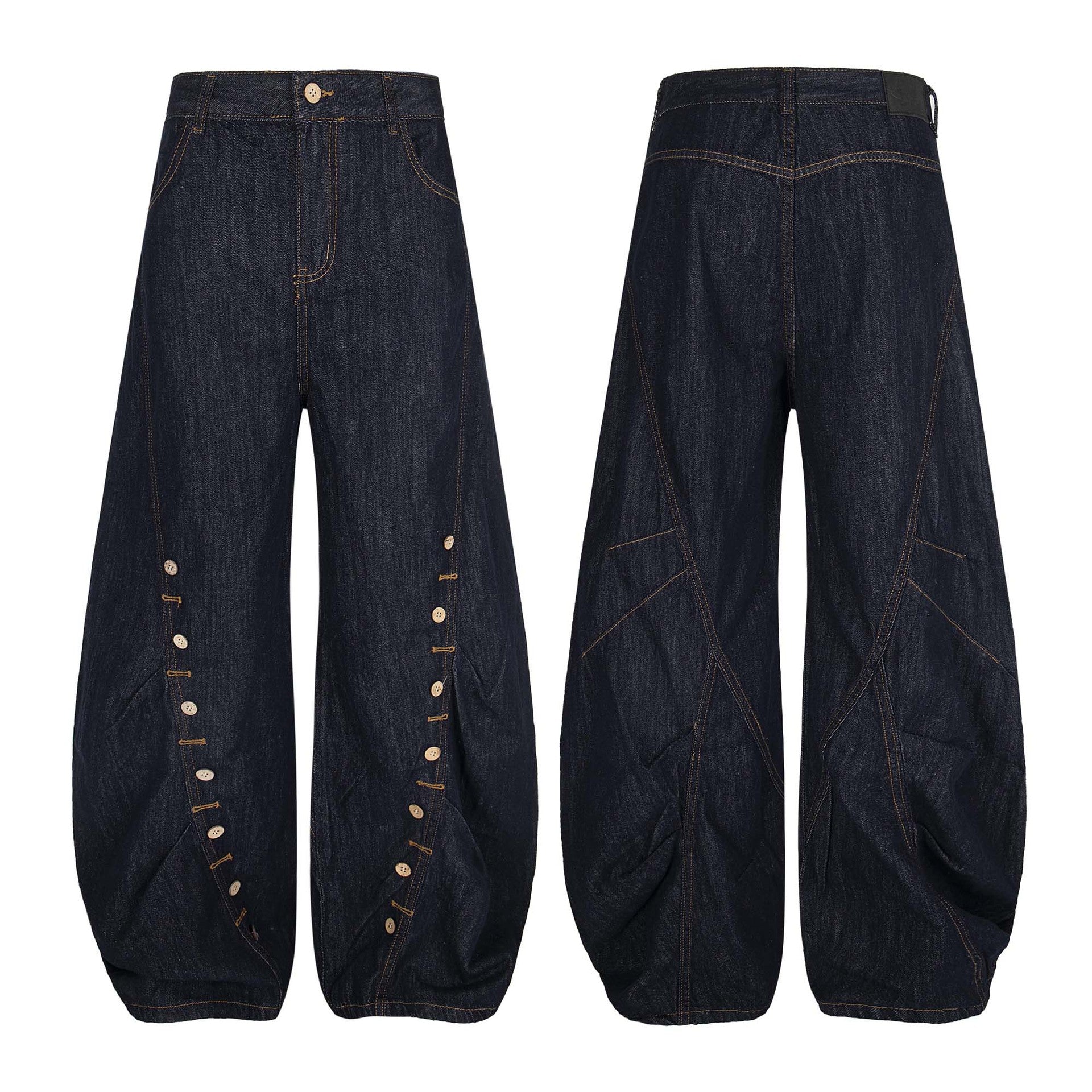 High Street  Pleated Button Decorated Flared Denim Pants Unisex Loose Wide Leg Straight Long Trousers