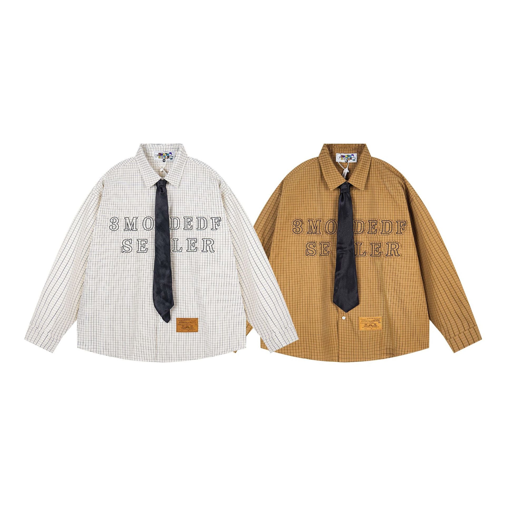 Letter Embroidery Striped Collar Long Sleeve Shirt Men's College Style Couple Loose Casual Shirt