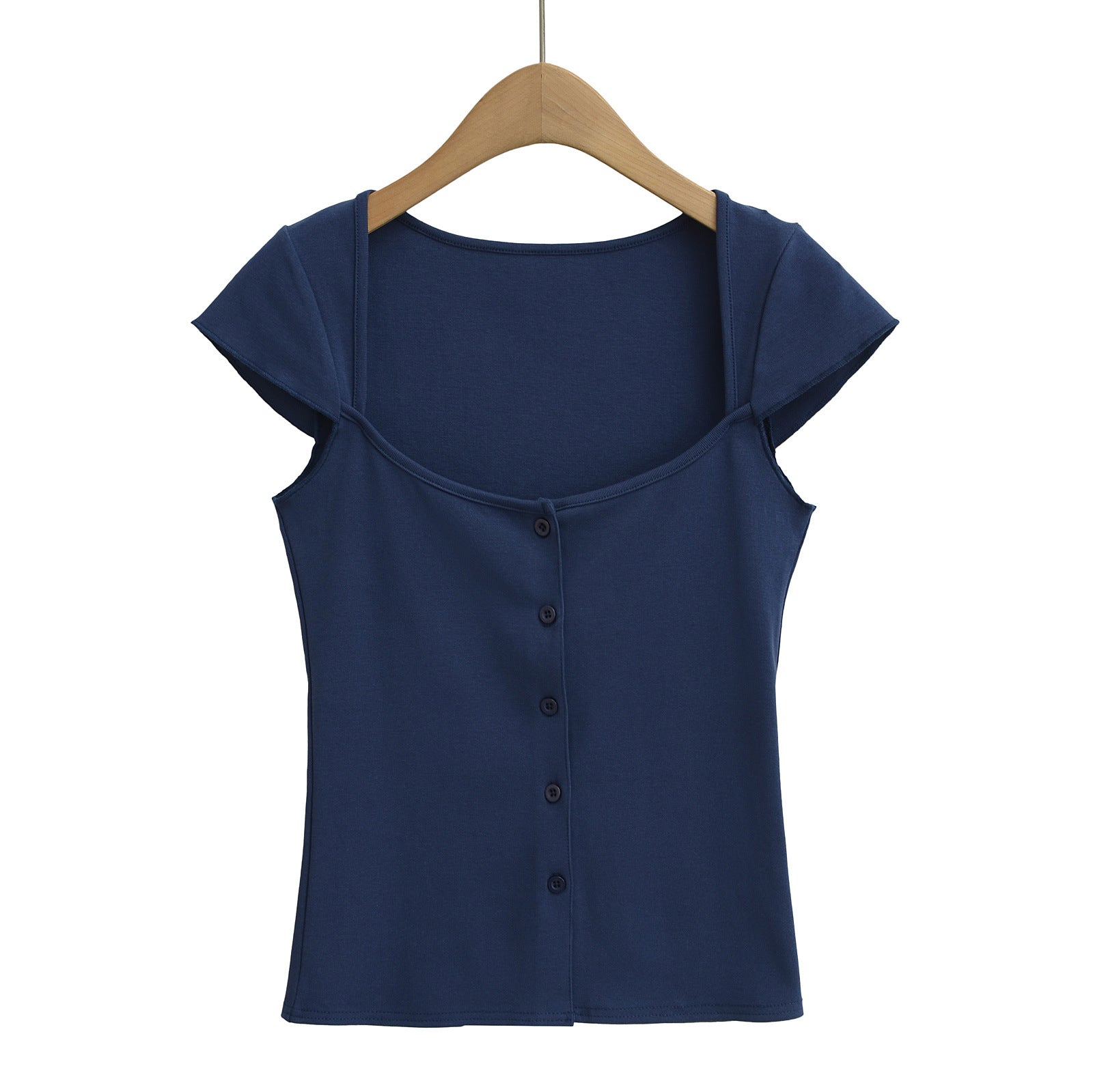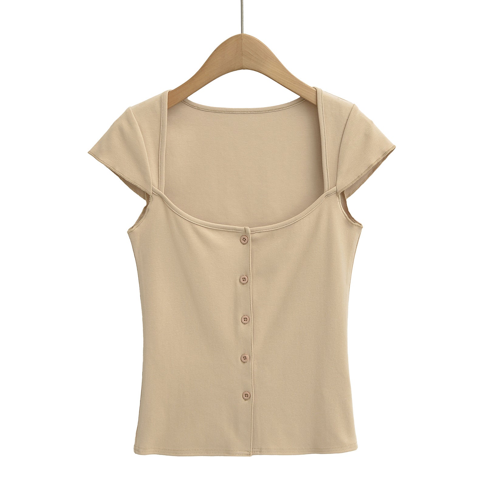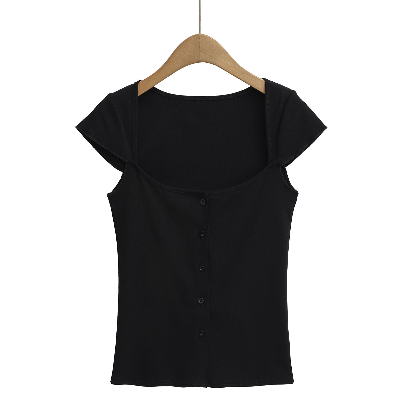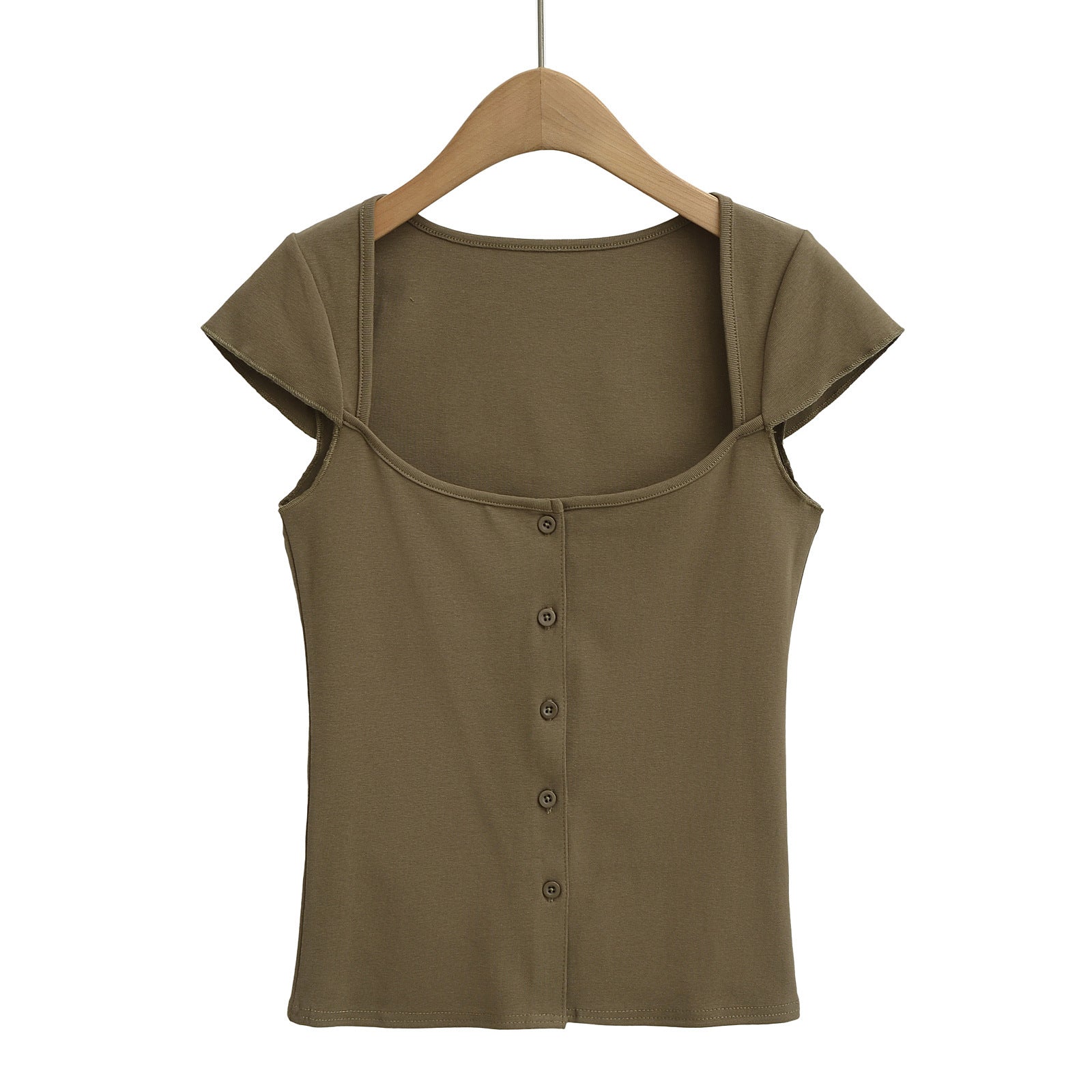 Square Neck Button Short Sleeve Fitted T-Shirt