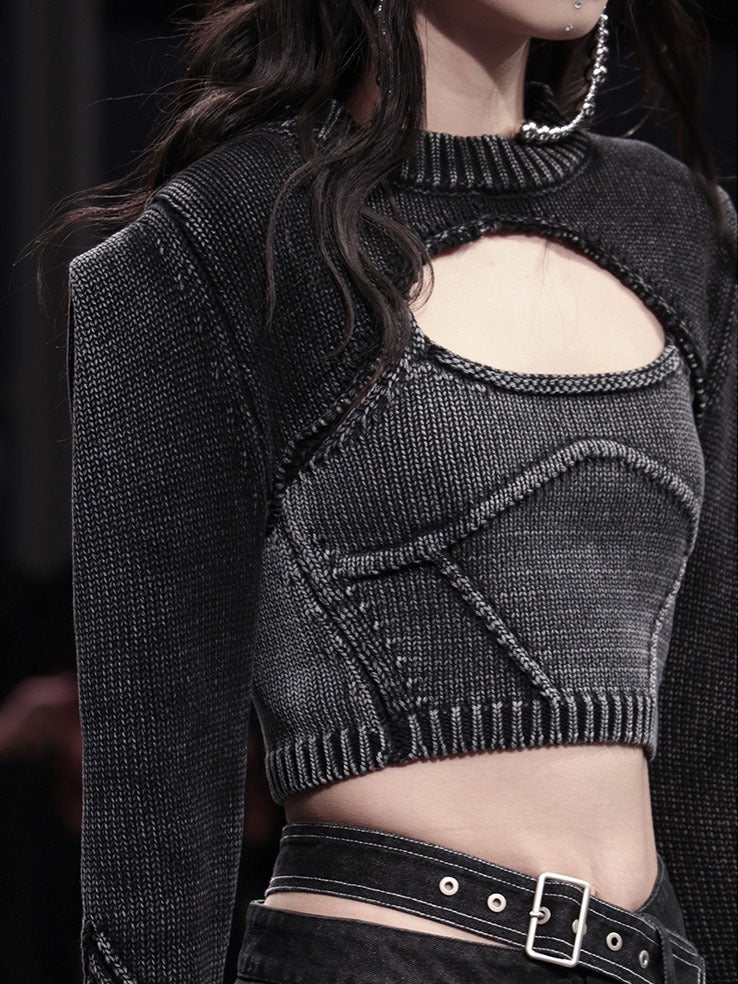 Streetwear Denim Two Piece Set Womens Square Collar Sleeveless Tanks O Neck Long Sleeve Tops Knitting Female Sets