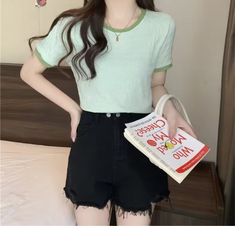 Style Short T-Shirt Women's Slim Fit Korean Version Base Layer with Wooden Edge Half Sleeve Top