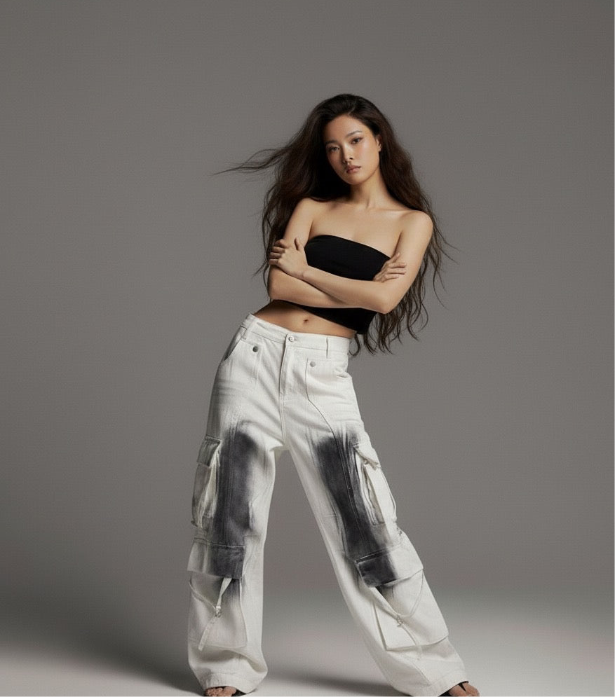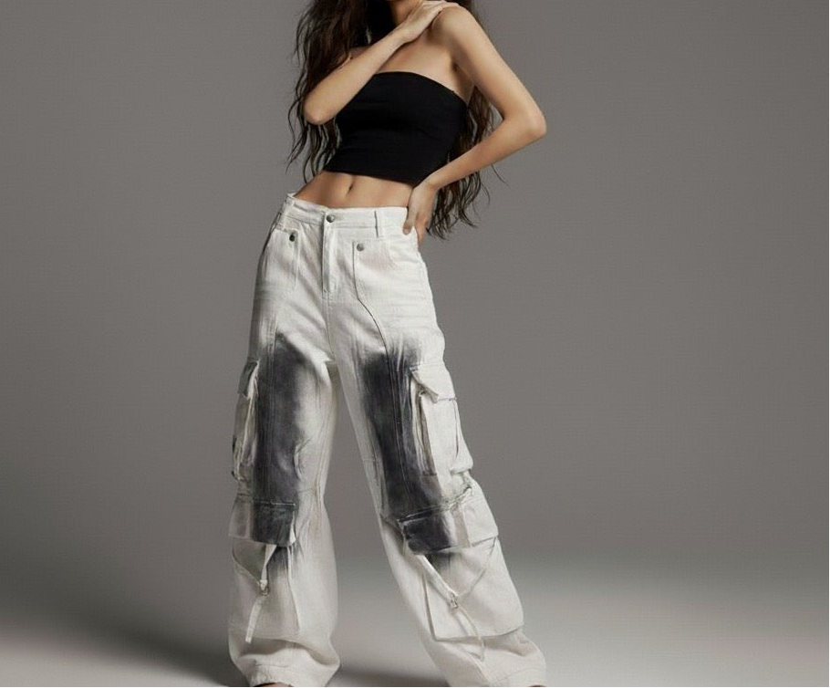 Trendy High Street Design Spray Ink Ribbon Dirty Denim Pants Men's Retro Vibe Style Unique Wide Leg Work Trousers
