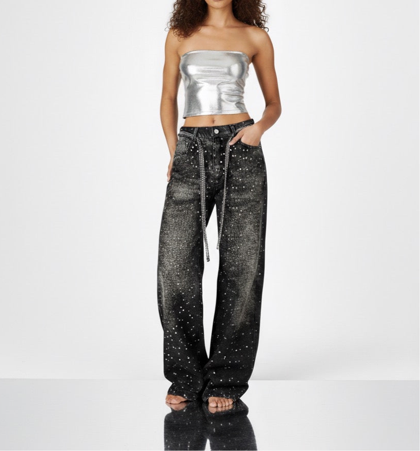 Washed loose wide leg printed jeans with a full diamond drop design straight leg pants