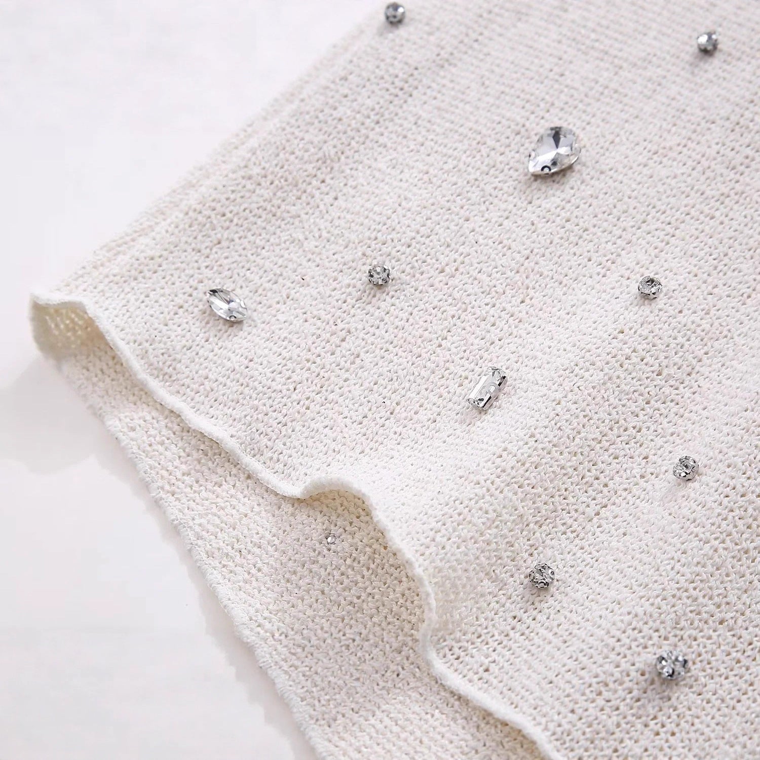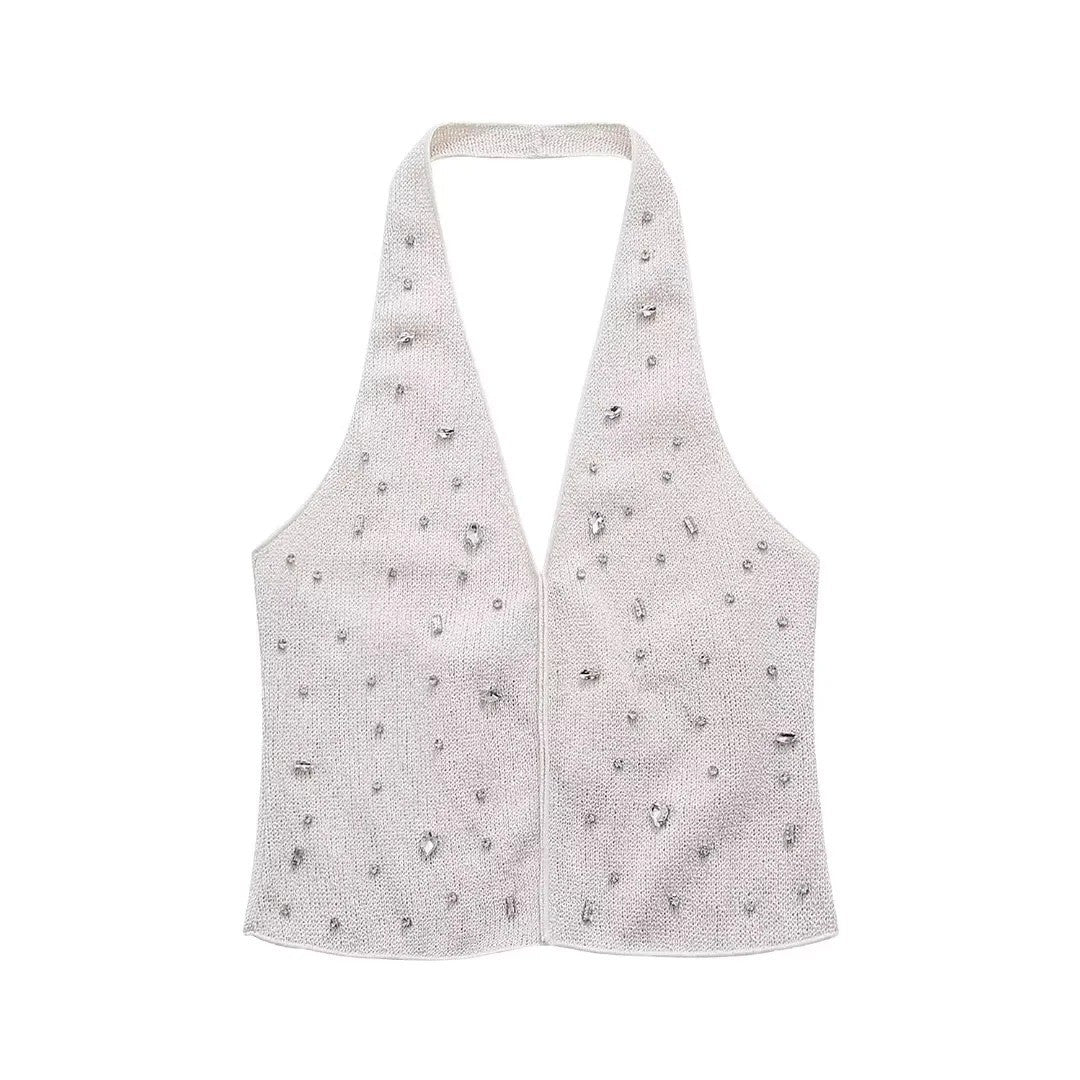 Women's Jewelry-Adorned Neckline Top + High-Waisted Wide-Leg Triangle Pants with Jewelry-Adorned Details
