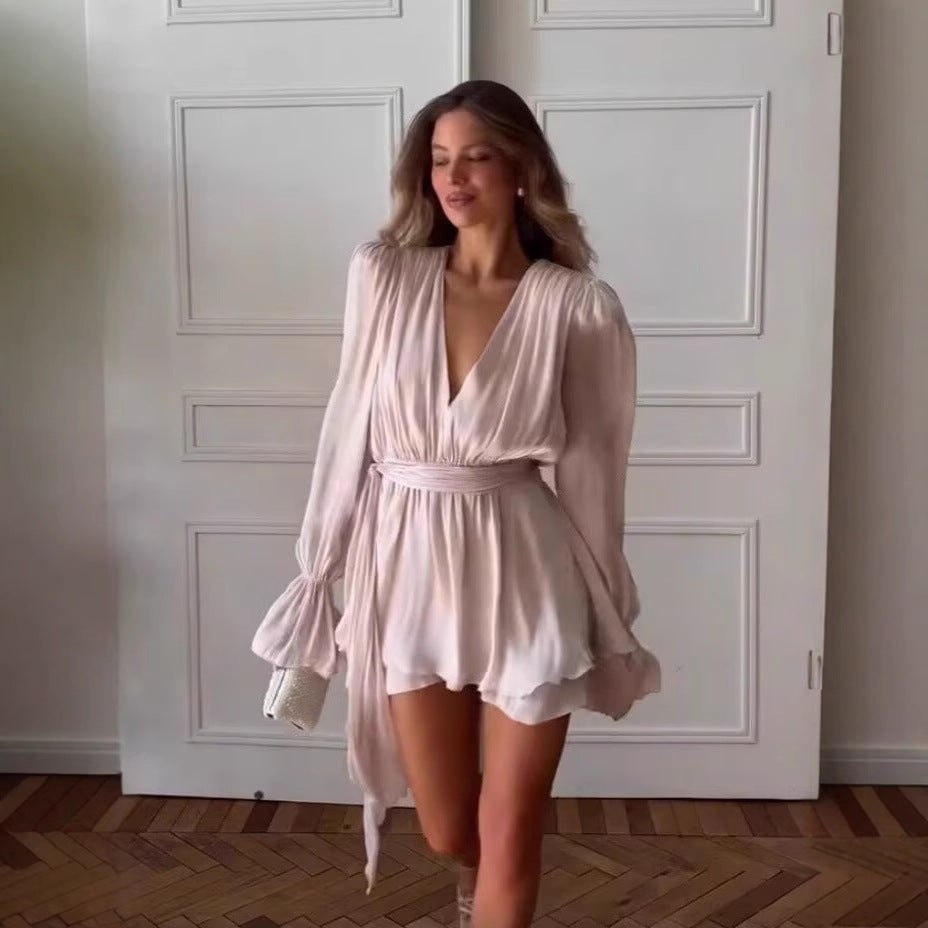 Women's V-neck Flare Sleeve Waist-tied Belted Dress